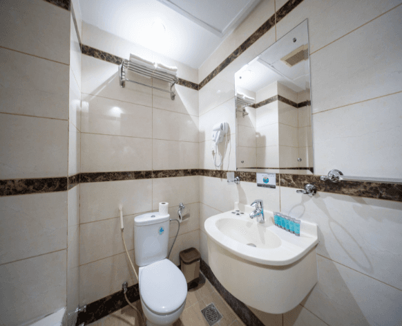 • حمام خاص مزود بدش ولوازم استحمام أساسية.